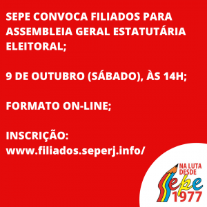 O Sepe convoca os profissionais de educação da rede estadual RJ para assembleia geral, que será realizada, de maneira virtual (plataforma Zoom), no próximo sábado (dia 18 de setembro) a partir das 14h.